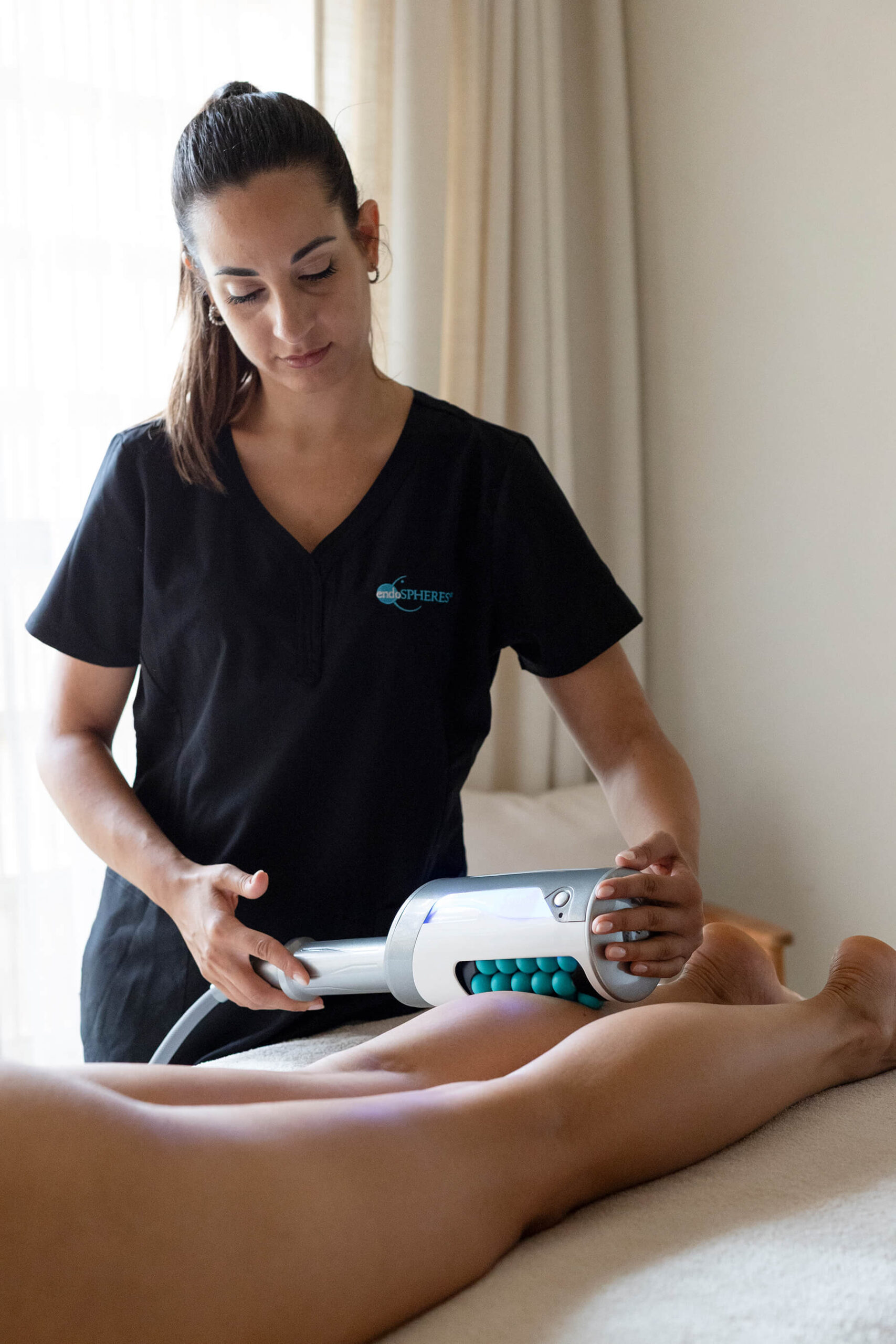 Endospheres Therapy produces a vibration and pressure combination that performs what we describe as “vascular gymnastics” on the body. This ‘workout’ promotes the drainage of fluids, whilst re-compacting the skin tissues. As the lymphatic system does not have a pump it relies on the mechanical movement of the body to “squeeze” lymph around the system. Endospheres® enhances this movement helping to encourage the drainage of fluids. In addition, there is an improvement of the microcirculation, the reduction of inflammation and pain, and muscle toning.